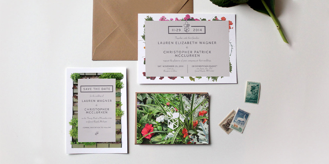 Various direct mail pieces which showcase illustration, copy writing and photo editing. These examples include wedding stationery, an offer mailer and a holiday card.